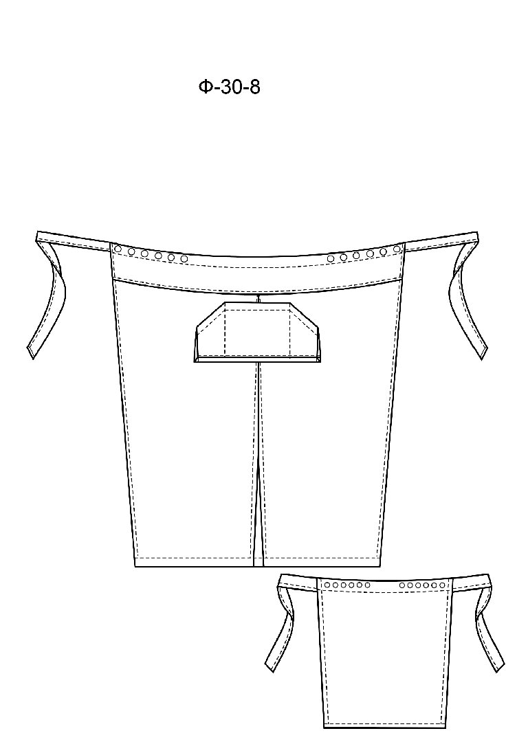 Полотно фартука прямое, на поясе на завязках, кокетка, от кокетки центральный шов с разрезом, по центру карман с 3-мя Pin Up