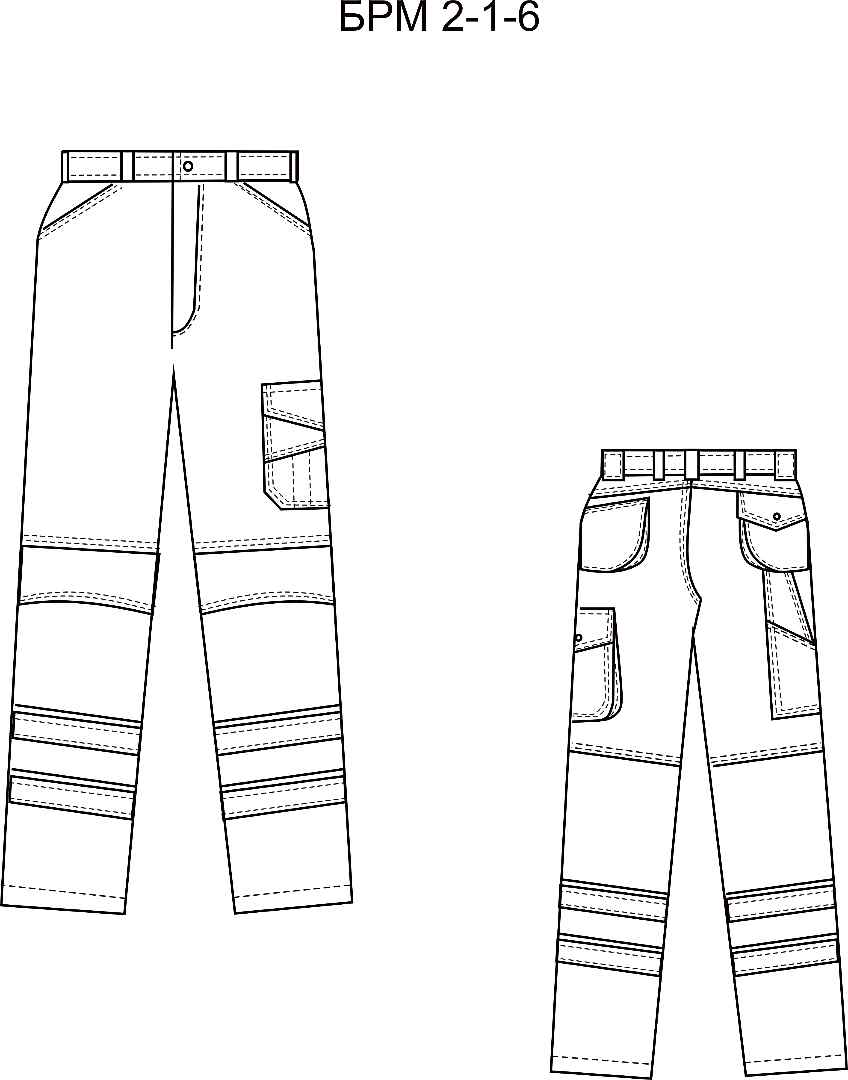 Карманы: прорезные - на передней половине брюк; на задней половине брюк и на боках в районе колена накладные полупортфели, левый с Pin Up